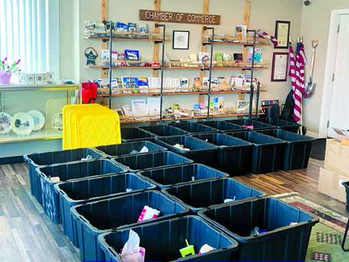 Welcome totes being assembled at the Chamber of Commerce to be gifted to new teachers on August 7.