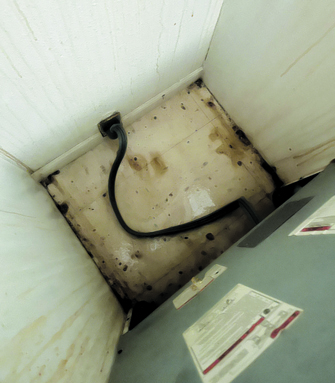 Area beneath a stove showing heavy grease buildup and an unsealed gap around a utility line, conditions that can allow roaches to remain active after treatment.