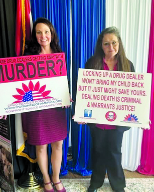 From left: State Rep. Ann Kelley and Laura Woody hold signs during the Missouri Federation of Republican Women 4th District Spring Meeting at the Family Restoration Center in Cedar County.