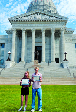 The 91st annual Sophomore Pilgrimage was held Tuesday, April 14, at the State Capitol. The event was hosted by the GFWC clubs of Missouri. Outstanding sophomores from high schools all over the state of Missouri are chosen to observe the inner workings of state government, to tour government buildings and to listen to top state officials. This year the El Dorado Springs GFWC Generation III club sponsored Jackson Bland, the recipient from the El Dorado Springs Christian School and Serenity Witt, the recipient from the El Dorado Springs R2 High School. They were joined by Michelle Leroux, El Dorado Springs R2 High School teaching and Shelly Barger GFWC Generation III. Pictured are Serenity and Jackson in front of the Capitol and Shell, Jackson, Serenity and Michelle with Representative Dane Deihl.