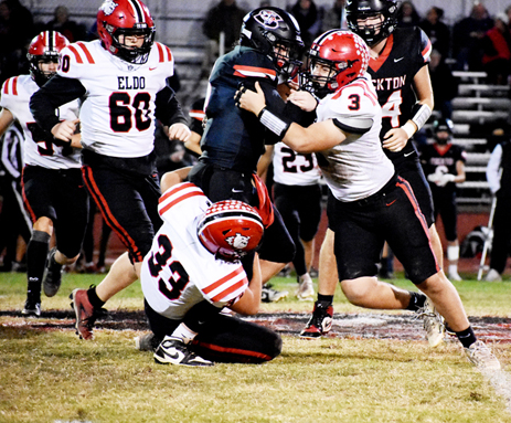 Connor Bradley slows the Stockton ball runner as Alec Farran closes in Friday night.